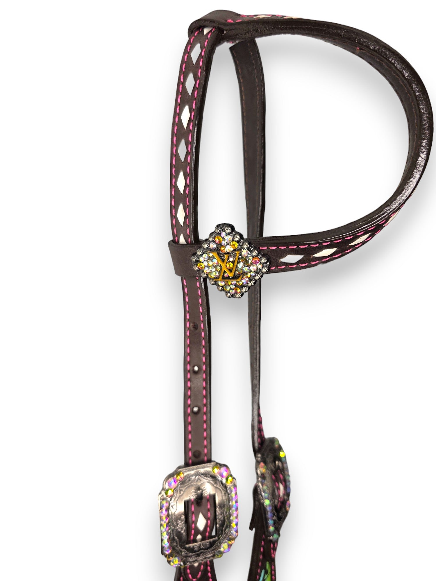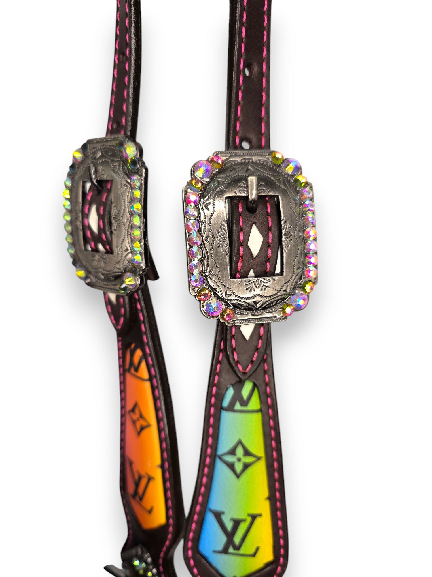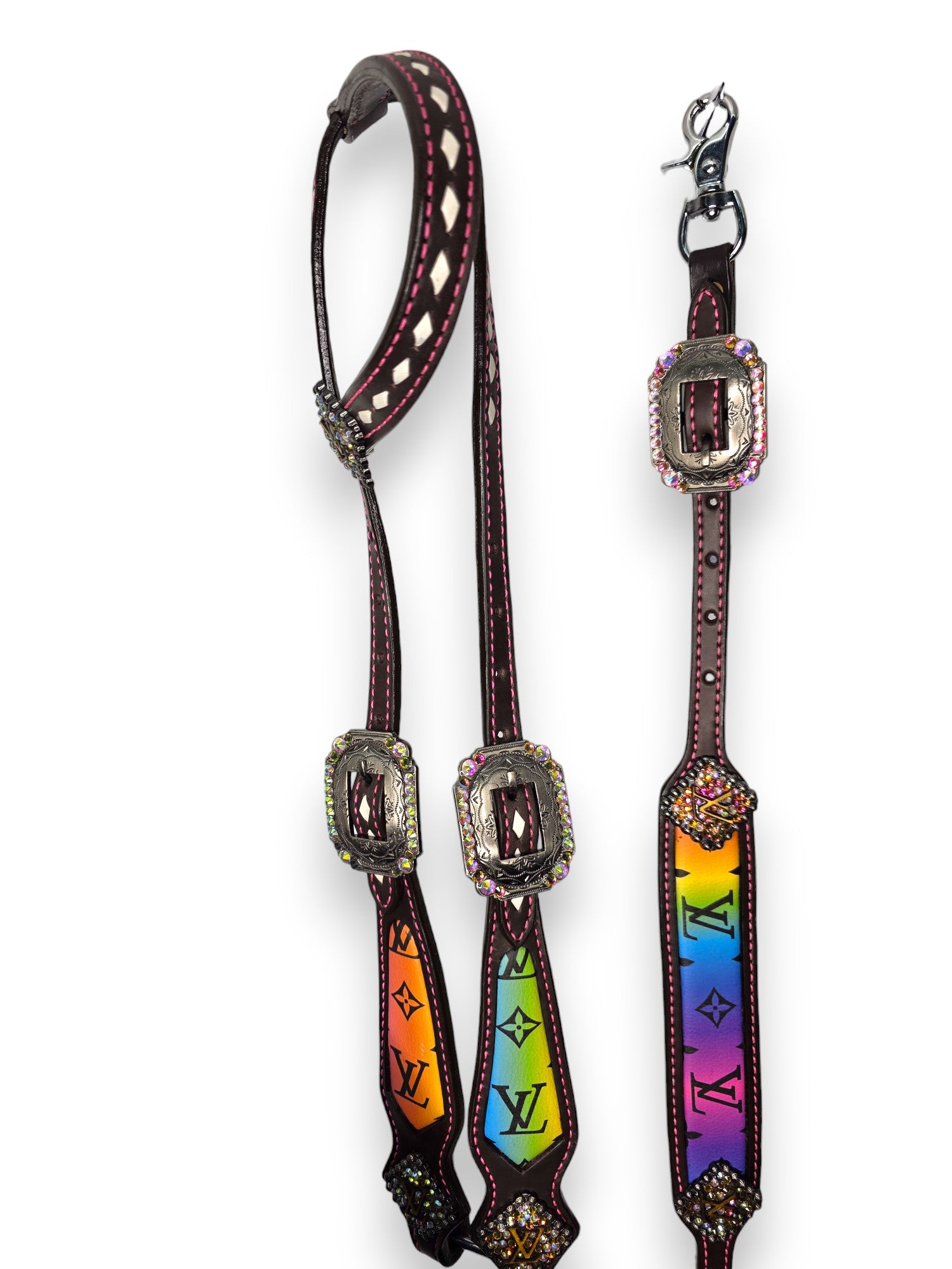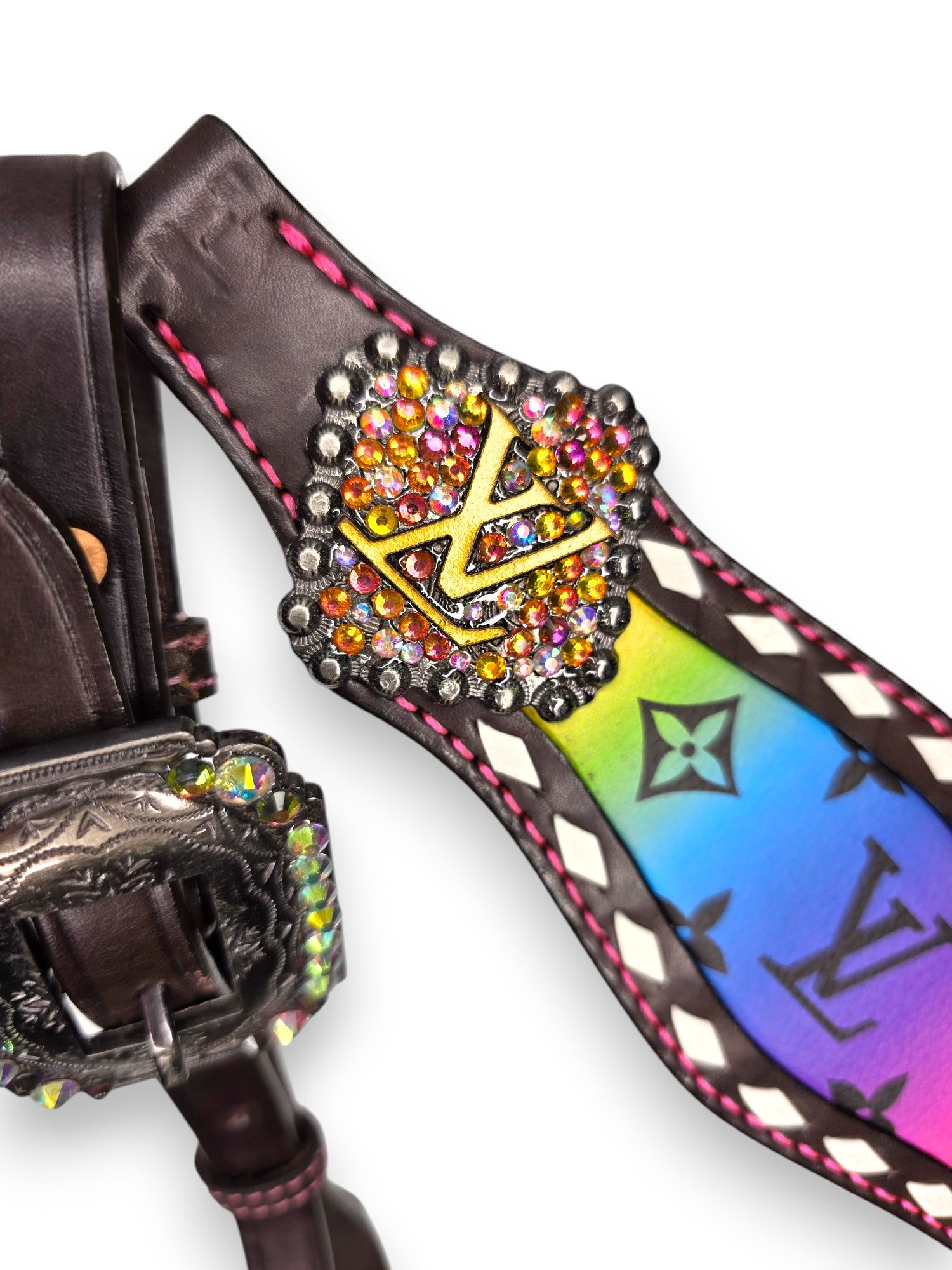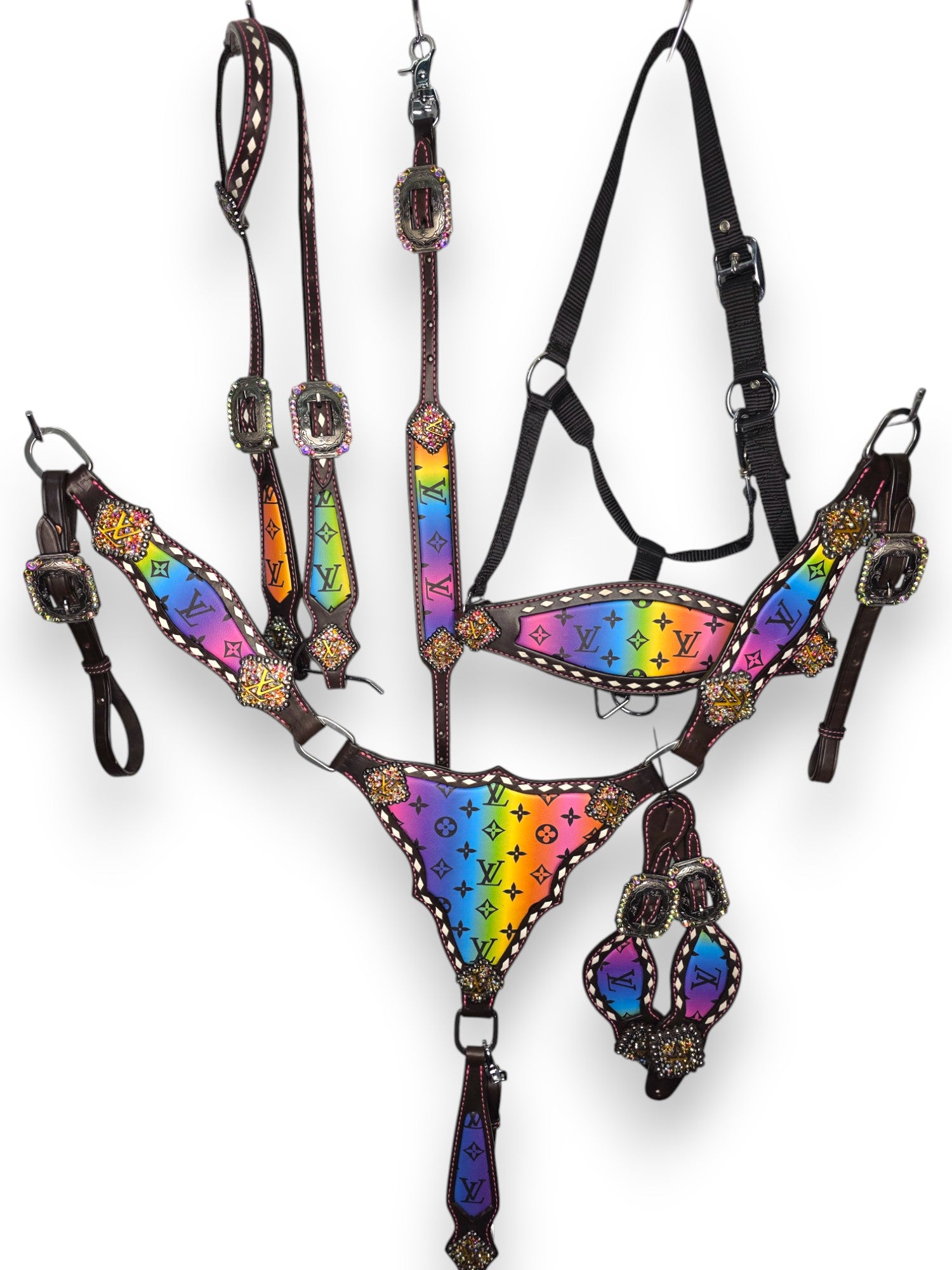 Step into the spotlight with the Prism Luxe Tack Set — a full-spectrum statement piece made for bold riders who crave colour and confidence. This collection explodes with vibrant rainbow hues layered over a designer-style monogram inlay, trimmed in bright pink stitching and diamond-edge rawhide lacing for next-level detail.